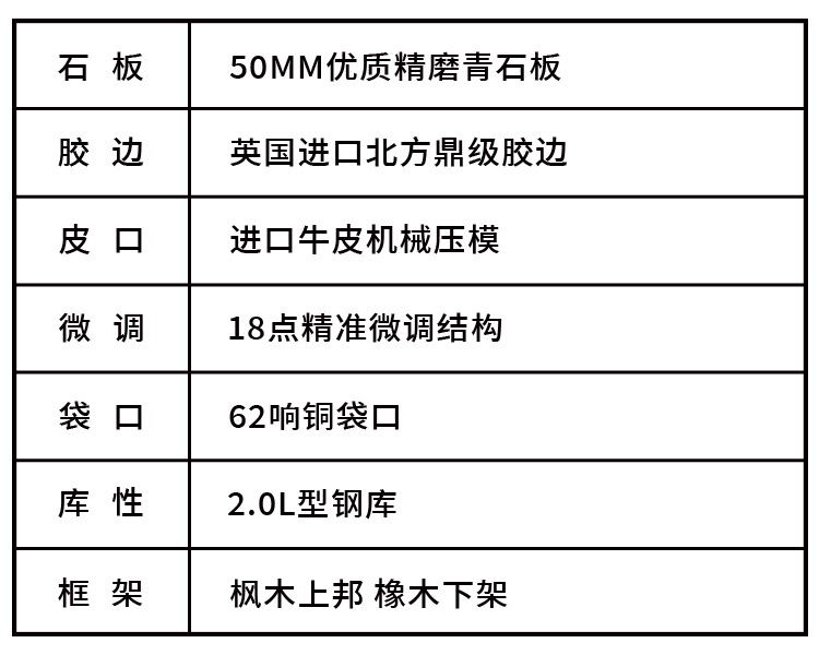 台球桌的质量关键在于石板、钢库、胶边、台布、球、杆等,配置越高,打感越好,越耐用,使用寿命越长!