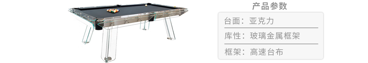 腾勃·水晶:水晶:特制超白水晶钢化玻璃台球桌,定制304不锈钢、钢化玻璃配件和纳米防划伤工艺赋予了产品独特的轻盈和时尚魅力,在提供优秀的运动的体验的基础上为球手提供一种新颖的运动体验。