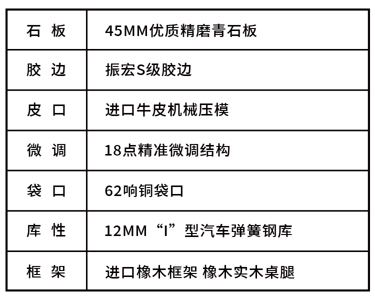 台球桌的质量关键在于石板、钢库、胶边、台布、球、杆等,配置越高,打感越好,越耐用,使用寿命越长!